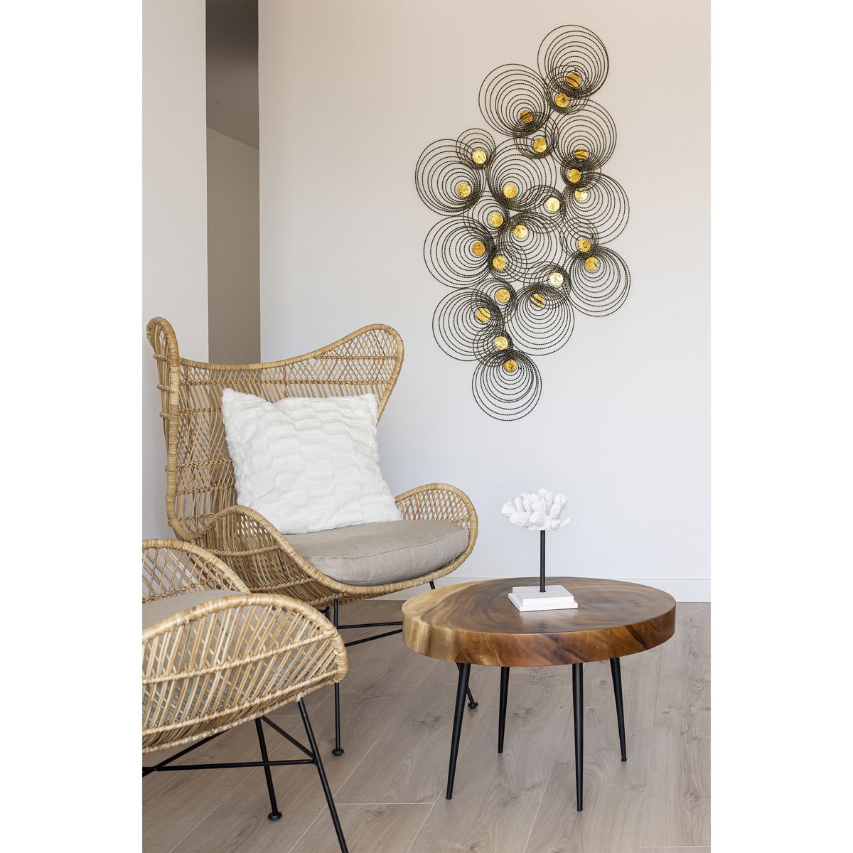 Escultura de pared fabricada en metal, con acabados dorado y dorado antique.